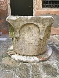 The Byzantine style, also called Veneto-Byzantine style, was heavily influenced by Christian architecture and Venice's close contact with the Byzantine Empire in the 11th to 13th centuries. Wellheads built in this style were either freestanding cylinders or cylinders surrounded by columns. They are characterized by their elaborate design, often featuring twisted columns and animals[10].