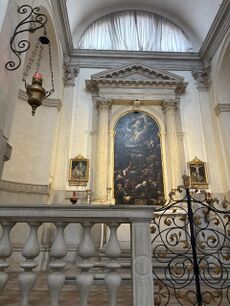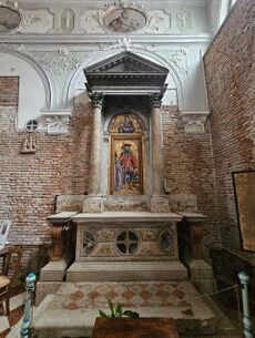 An altar, or in Italian altari, is a tablelike construction used in the Christian church in celebrating the Eucharist. [1] Altars can range from being simple tables to intricate stone pieces with carved figures on the front and sides. These figures typically depict biblical figures or stories. The main altar of a church is a focal point of the interior, being located at the end on the nave, and the center of the transept. Larger churches may have additional smaller side altars in addition to the main altar, where masses and other religious ceremonies can be held in a more intimate setting. Altars frequently hold relics connected to saints and martyrs of the Catholic Church.