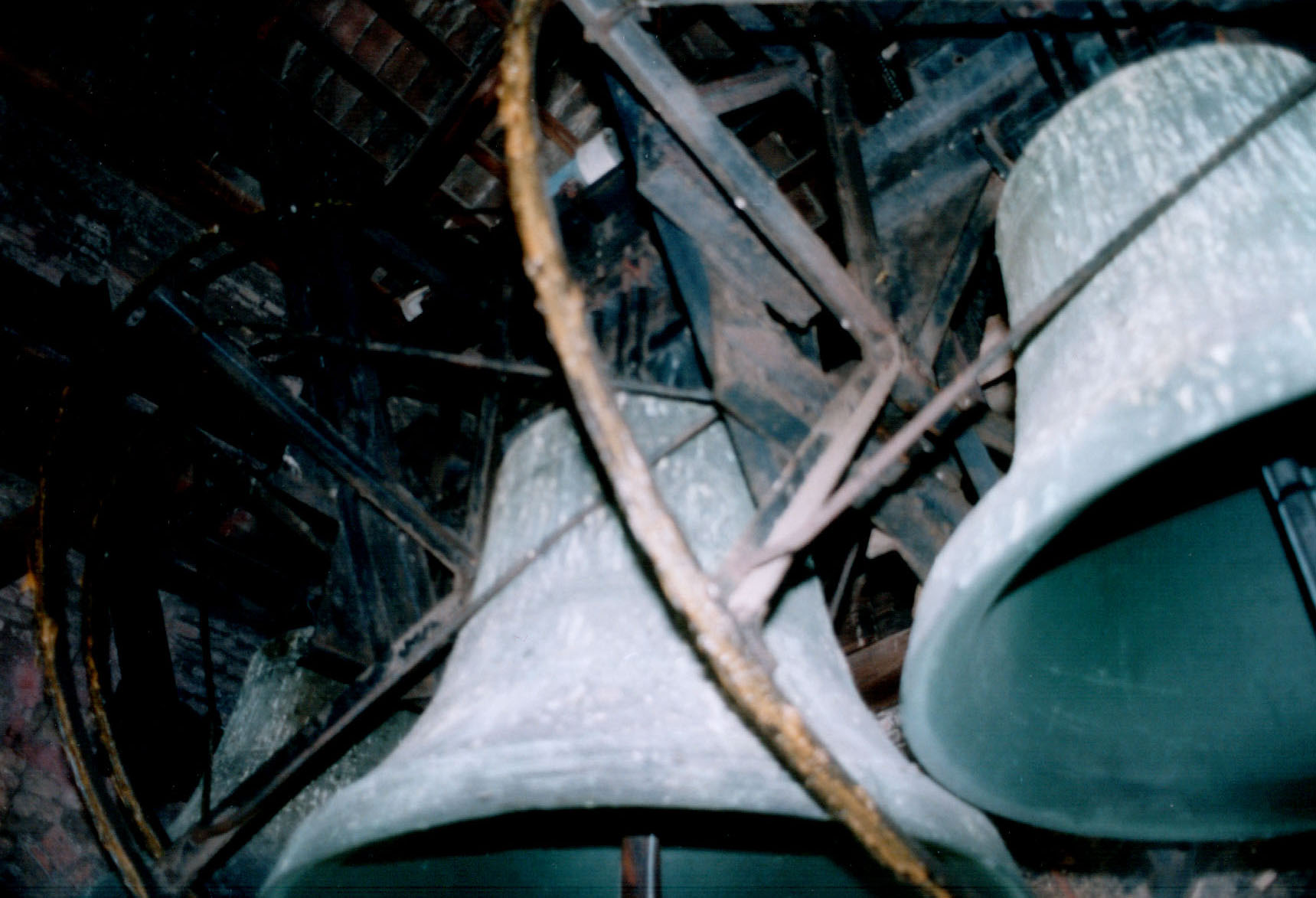 The belfry is made of an unknown material with its bells supported in an unknown fashion.